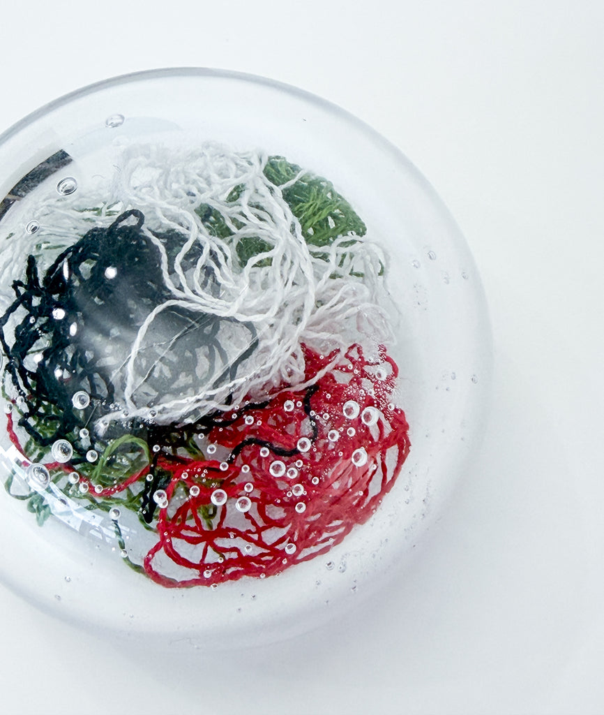 The layering of the threads, the way the colors blend, and the presence and placement of air bubbles all differ from piece to piece—no two are the same.Viewed through the glass, parts of the threads may appear slightly magnified or subtly curved, and the appearance shifts depending on the angle and the lighting conditions.